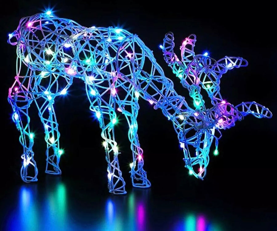 A stunning 60cm White Rattan Tatton Grazing Stag! With 80 colour changeable LEDs. Experience the magic and versatility of this majestic reindeer.