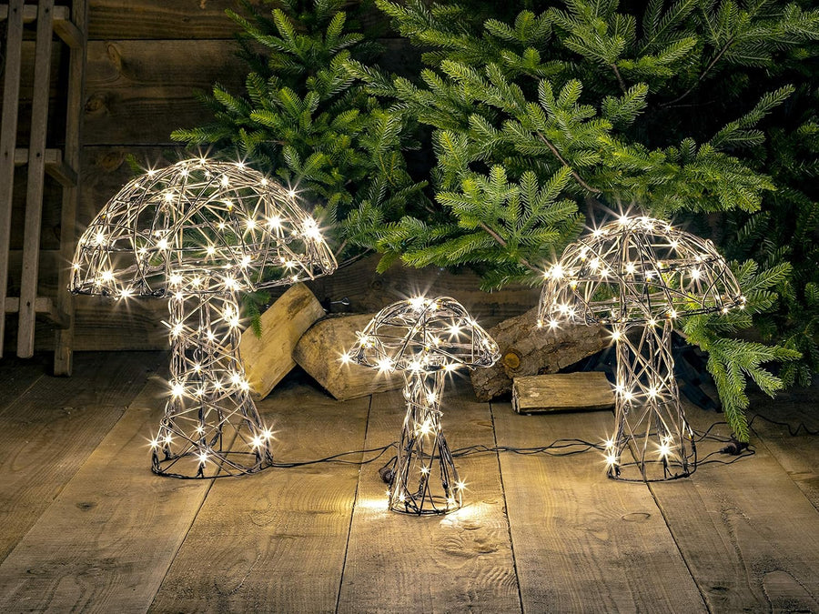 Light up your garden with this set of 3 warm white brown wicker mushrooms! Their unique design and soft glow will create a magical atmosphere for any outdoor space. The mushrooms are made of durable wicker material and have a long-lasting LED light source for up to 8 hours of illumination. Perfect for adding a touch of whimsy to your garden, these mushrooms are sure to become a conversation starter.