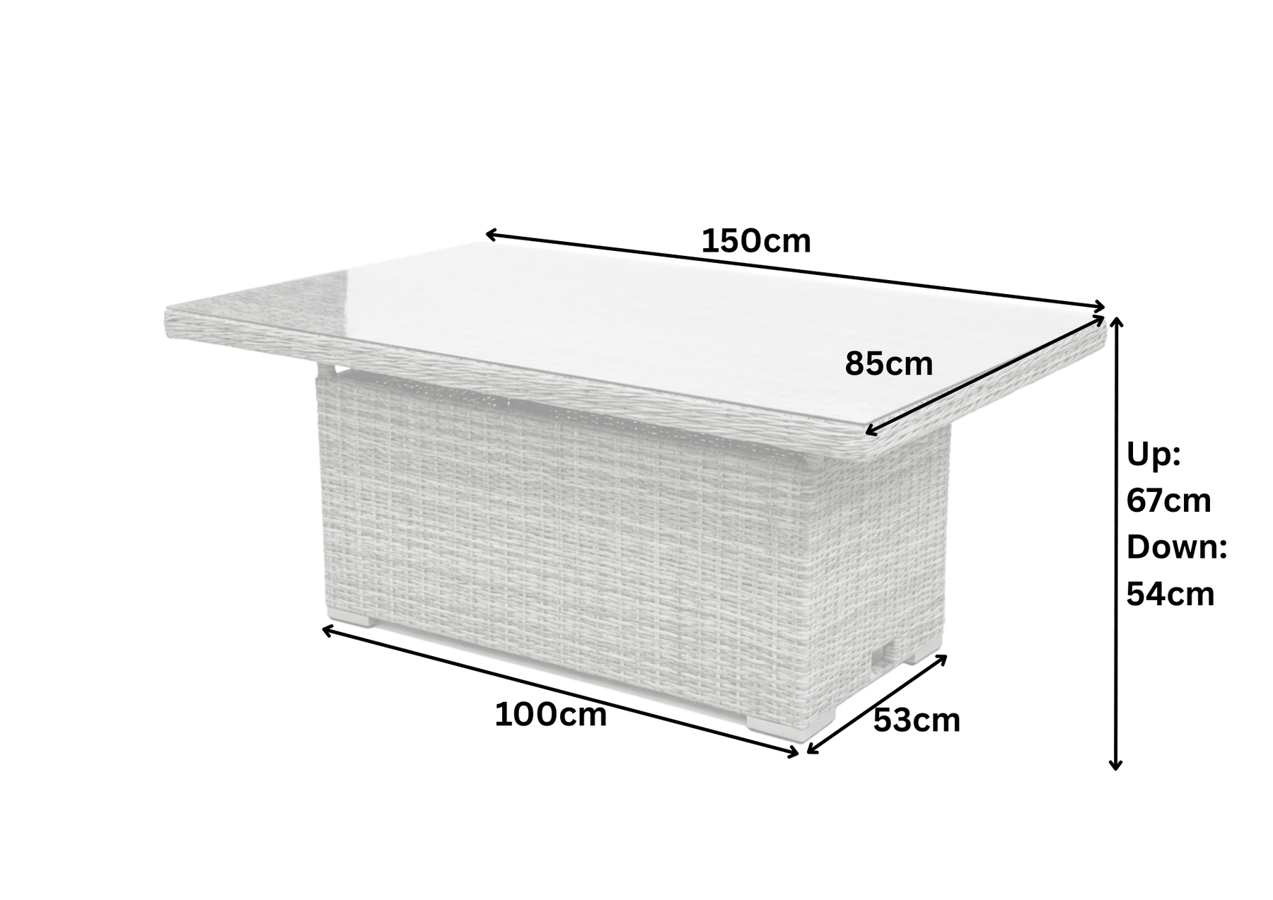 Width 150cm x Depth 85cm x Height when Low 54cm / Height when High 67cm