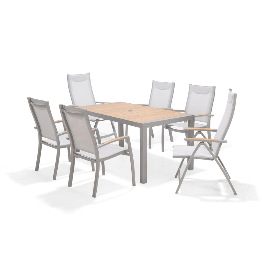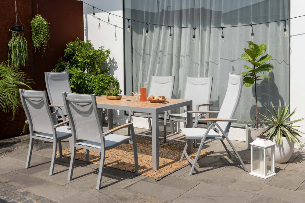 This practical garden dining set offers a brilliant combination of modern good looks and no-fuss maintenance. The inclusion of two recliner chairs in the six-person garden dining set offers extra versatility – they are perfect for relaxing in your conservatory or on your garden terrace.