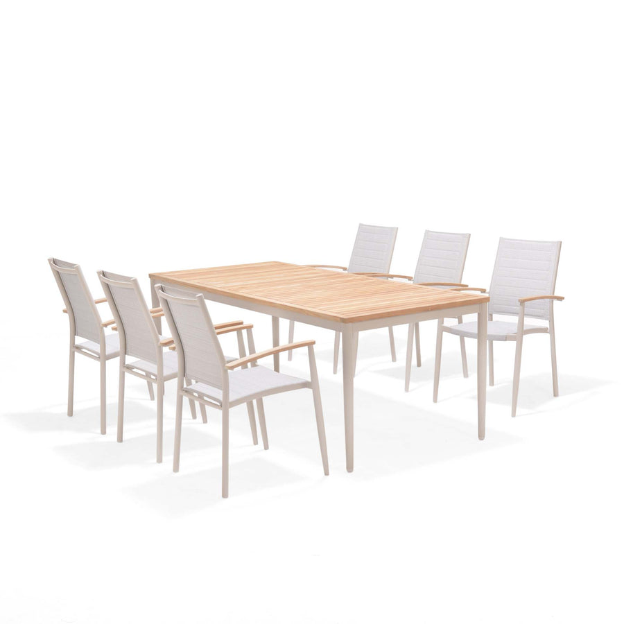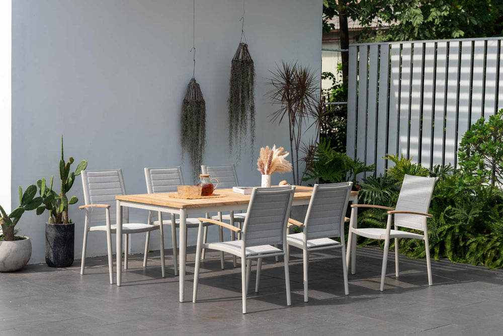 Stacking chair in rust-free cream-coloured aluminium frame with highly durable and maintenance-free Weather-net® support. Armrests in robust Teak FSC®-certified adds in comfort and style. Rectangular table in rust-free cream-coloured aluminium frame with robust Teak FSC®-certified tabletop.