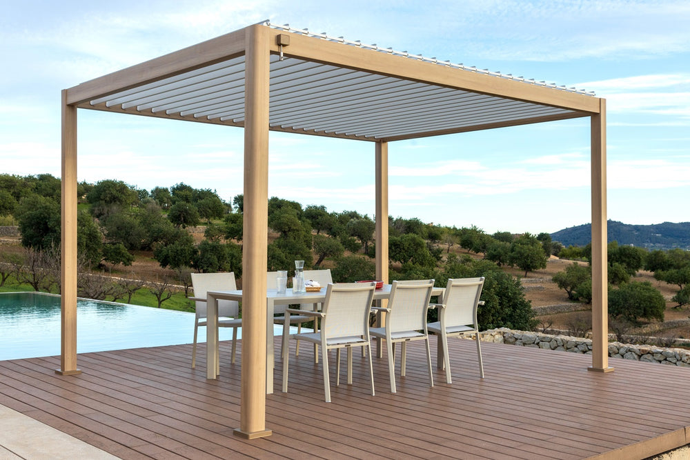 Made from premium rust-free aluminium frames in warm and natural looking oak-pattern and white colour, our Pergola creates a welcoming and charming shaded space for any dining and outdoor entertaining occasions.
