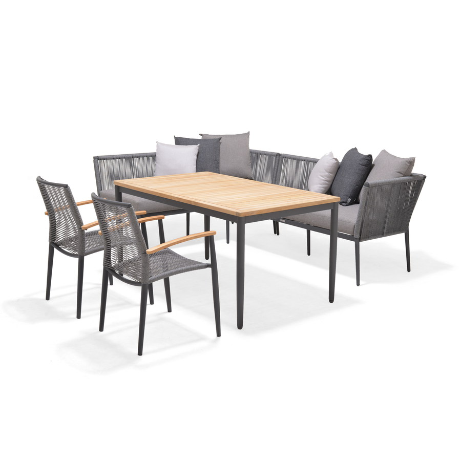 Two rustfree aluminium stacking chairs with stylish rope-woven back and seat support. Two 2-seater sofas with rope woven back support and cushions in premium Olefin fabric. Durable aluminium dining table with Teak FSC®-certified table top