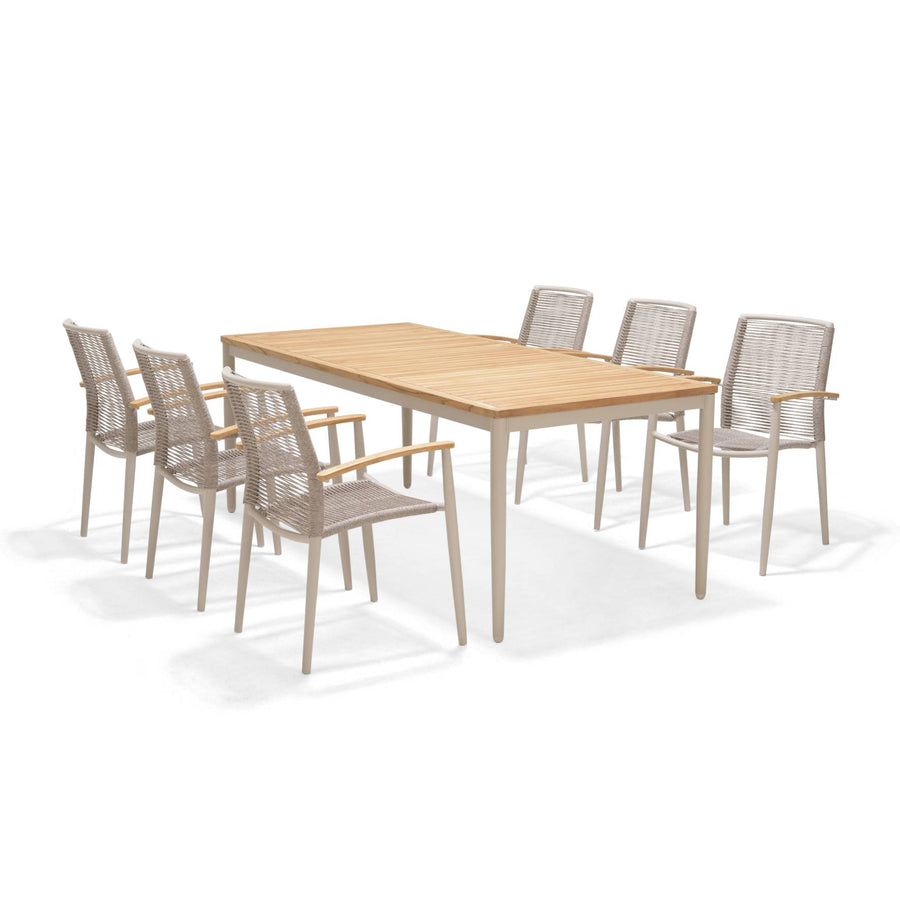 Stacking chair in rust-free cream-coloured aluminium frame with highly durable and flexible Rope®-woven seat support. Armrests in robust Teak FSC®-certified adds in comfort and style. Rectangular table in rust-free cream-coloured aluminium frame with robust Teak FSC®-certified tabletop.